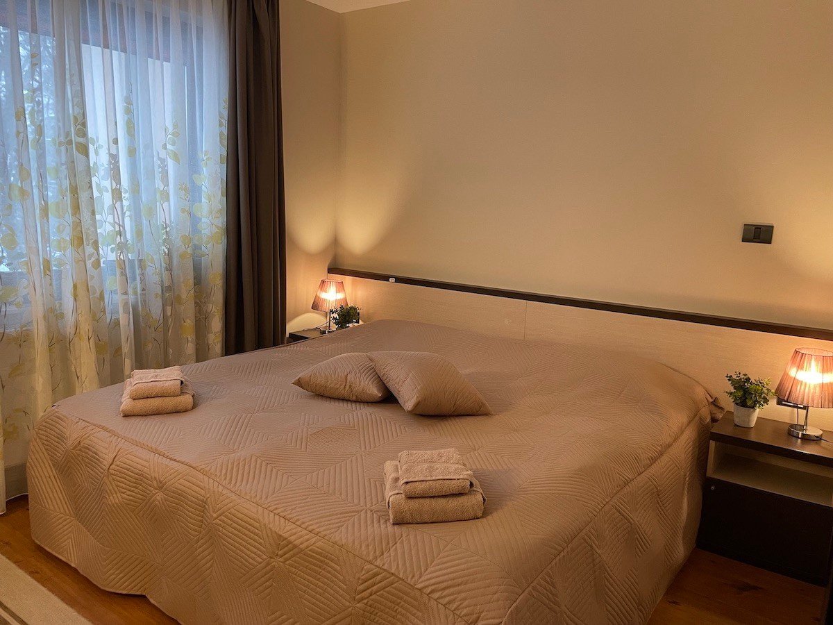 Голямата спалня е обзаведена с удобно легло, а