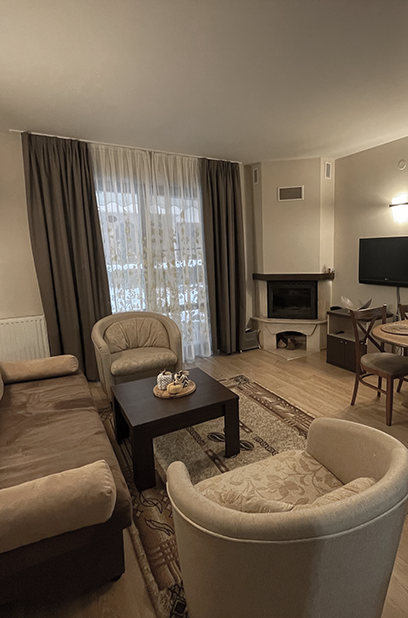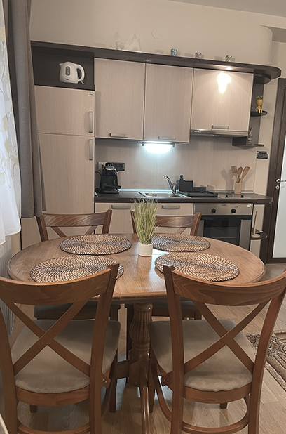 дневна, оборудвана с мека мебел и кухненски
